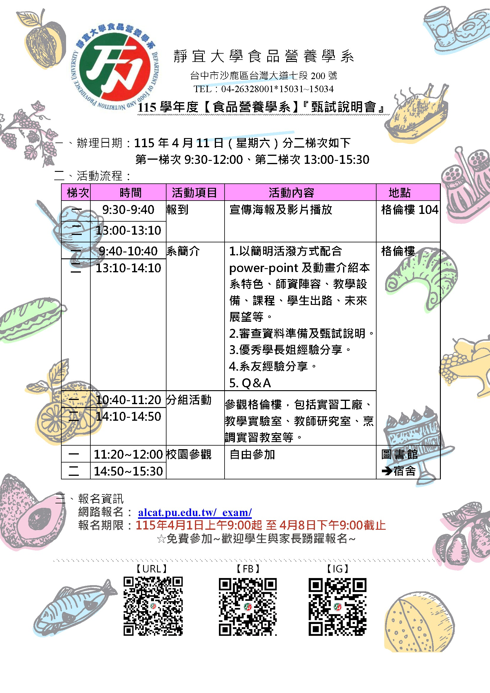 為了讓大家更深入瞭解靜宜大學食品營養學系(食營系)的教學環境、課程特色及未來就業方向,本系將於 115 年 4 月 11 日(星期六) 舉辦「甄試說明會」。現場將提供寶貴的面試建議與學長姐經驗分享,誠摯邀請大家踴躍報名參加!
