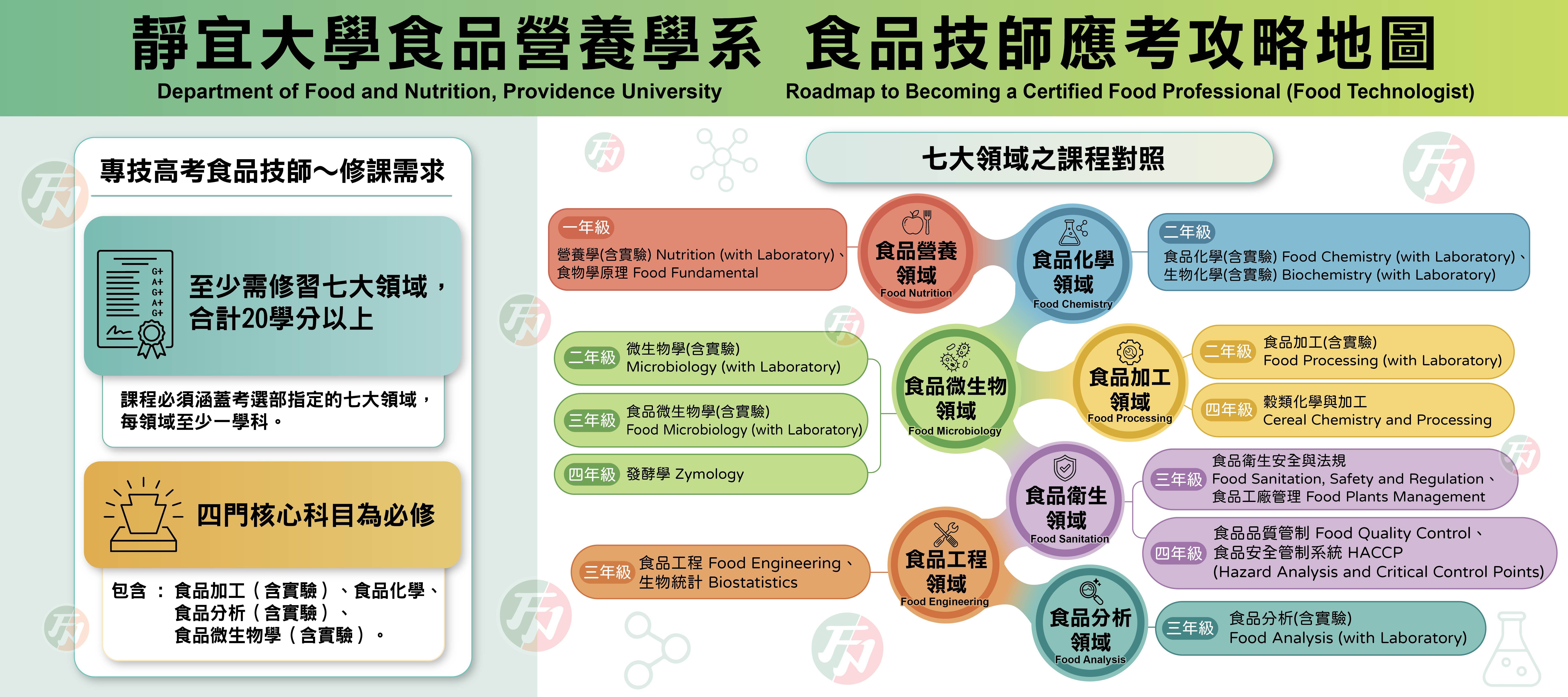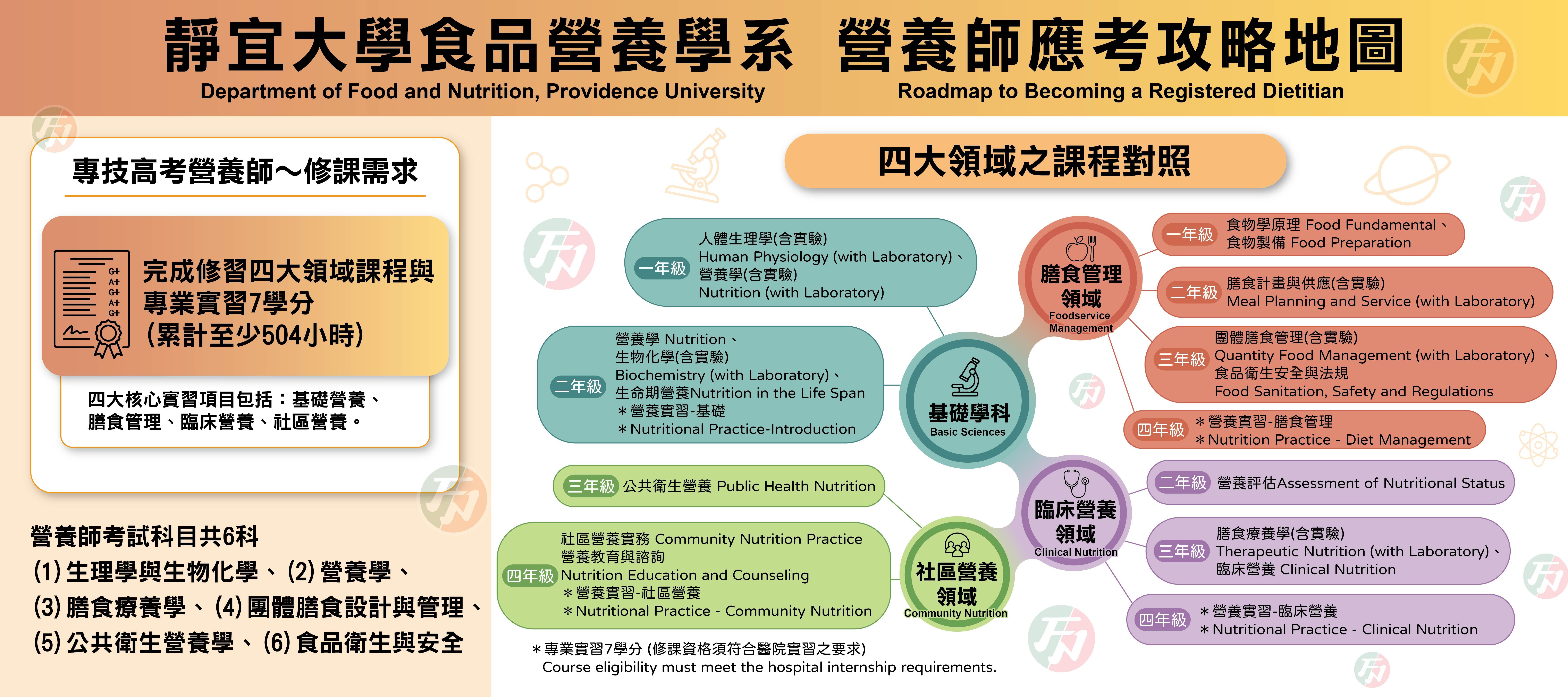 - • 職場實務與應用:學校午餐管理實務 / 營養實習(膳食/臨床/社區) / 企業實習 / 食品安全管制系統應用 / 智慧科技與食品營養